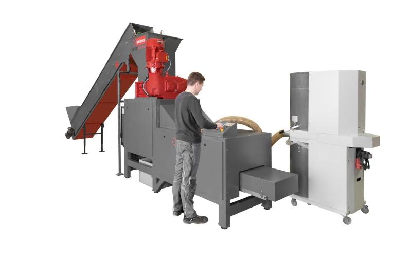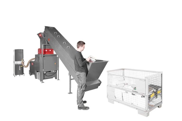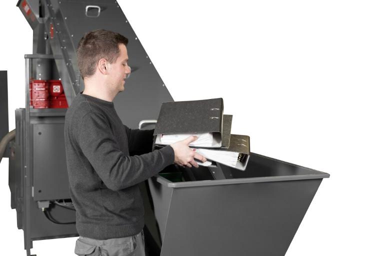 Vi kan tilby store anlegg med ulike inmatningsmuligheter og transportbånd av makulatur fra maskin til container som er plassert både innendørs og utendørs.